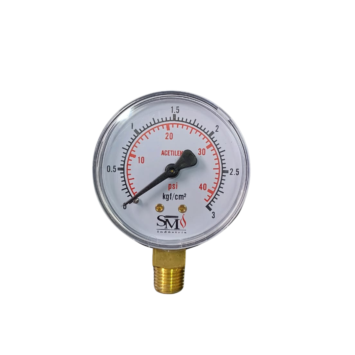 Manômetros tipo bourdon com escala dupla (kgf/cm² ou psi) para gases diversos.