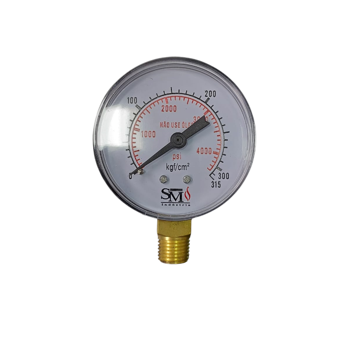 Manômetros tipo bourdon com escala dupla (kgf/cm² ou psi) para gases diversos.
