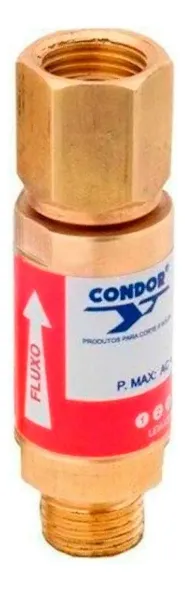 VÁLVULA CORTA FOGO 9/16" UNF ACETILENO/GLP/GN PARA MAÇARICO VCF MG CONDOR para ser utilizada na conexão de entrada do maçaricos de corte, , solda ou aquecimento na conexão de gás com função de extinguir possíveis retrocessos de chama e impedir a propagação do fogo, com dois sistemas de segurança, sendo: 1-Retenção: impede o fluxo reverso dos gases. 2-Corta Chama: elemento responsável por extinguir o retrocesso de chama por absorção de calor do fogo, pelo filtro sinterizado.