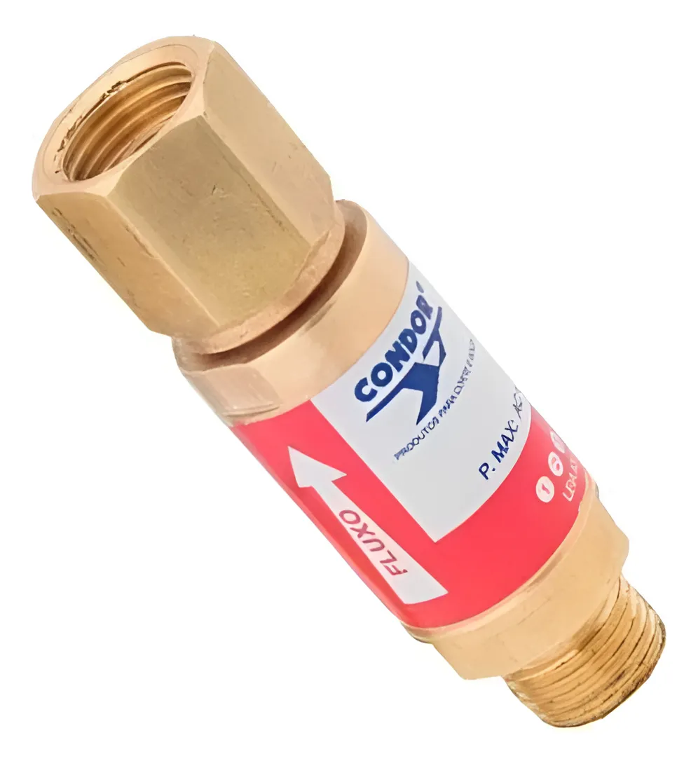 VÁLVULA CORTA FOGO 9/16" UNF ACETILENO/GLP/GN PARA REGULADOR VCF RG CONDOR para ser utilizada na saída dos reguladores de Acetileno , GLP/GN ou Hidrogênio, com função de extinguir possíveis retrocessos de chama e impedir a propagação do fogo, com dois sistemas de segurança, sendo: 1-Retenção: impede o fluxo reverso dos gases. 2-Corta Chama: elemento responsável por extinguir o retrocesso de chama por absorção de calor do fogo, pelo filtro sinterizado.